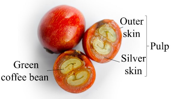 ■ 커피체리(Coffee Cherry) 커피 꽃이 떨어지고 나면 그 자리에 열매를 맺게 되며 초기에 녹색이었다가 익으면 빨갛게 되는데 이를 체리(Cherry) 또는 커피체리(Coffee Cherry)라 부르며, 길이가 15~18mm 정도이다.  꽃이 핀 후 열매가 익는데 걸리는 기간은 아라비카 종의 경우 6~9개월 정도이다. 맨 바깥의 껍질인 외과피(Outer-skin)를 벗기면 약 2mm 두께의 젤리같이 미끈미끈한 점액질의 과육 부분이 있는데, 이를 펄프(Pulp)라고 부르며 그 안에 생두를 감싸고 있는 단단한 껍질의 내과피(Endocarp)가 파치먼트(Parchment)이다.  내과피 안에 각각의 생두에 부착되어 있는 얇은 막을 은피(Silver-skin)라고 부른다. 생두는 빈(Bean)이라고 하는..